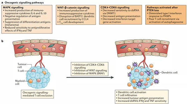 ? ? ?? a.致癌信號通路提供了獨特的免疫逃逸的腫瘤內(nèi)在機制。在這里,我們重點介紹了與抗腫瘤免疫有關(guān)的四個關(guān)鍵致癌信號通路:有絲分裂原活化蛋白激酶(MAPK)信號通路,WNTβ-連環(huán)蛋白通路,細胞周期蛋白依賴性激酶4(CDK4)CDK6細胞周期信號通路和激活的 磷酸肌醇磷酸酶PTEN丟失的結(jié)果。