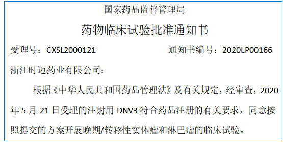 ◆ 參加杭州高新區(qū)(濱江)云端會“5050云路演”活動,和多家投資機(jī)構(gòu)達(dá)成了投資意向。 4月/April ◆ 時邁藥業(yè)通過云答辯,成功獲評“2019年度杭州市領(lǐng)軍型創(chuàng)業(yè)團(tuán)隊“稱號。 5月/May ◆ 時邁藥業(yè)帶著iBiBody和proBiBody雙特異性抗體平臺上線濱江先鋒e碼的云展會。 ◆ 源頭創(chuàng)新免疫檢查點(diǎn)單抗DNV3創(chuàng)新藥臨床試驗(yàn)申請獲NMPA正式受理。 6月/June ◆ 時邁藥業(yè)成功入庫“國家級科技型中小企業(yè)”。 7月/July ◆ 時邁藥業(yè)入選“浙江省科技型中小企業(yè)”。