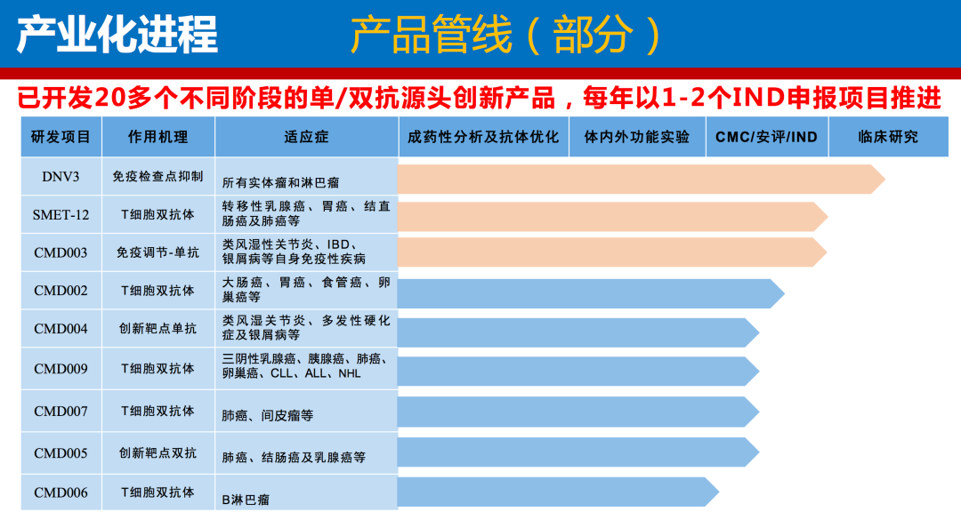 ? ? ? ?SMET12一端靶向腫瘤細(xì)胞高表達(dá)的EGFR,另一端靶向免疫T細(xì)胞表面的CD3抗原,可將T細(xì)胞集中至腫瘤細(xì)胞處,并激活T細(xì)胞對腫瘤細(xì)胞進(jìn)行免疫殺傷,從而抑制腫瘤細(xì)胞生長,有望實現(xiàn)雙抗藥物對實體瘤的有效治療。其中,表皮生長因子受體(EGFR),又稱ErbB-1或HER1,在非小細(xì)胞肺癌、乳腺癌、頭頸癌、宮頸癌、膀胱癌、胃癌等一些實體腫瘤高表達(dá)。 ? ? ? ?臨床前研究顯示,經(jīng)SMET12治療后,體內(nèi)抑瘤率達(dá)90%以上,且耐受性良好,細(xì)胞因子風(fēng)暴風(fēng)險低,預(yù)期臨床應(yīng)用安全可靠。此外,SMET12的CMC工藝開發(fā)相對簡便,通過常規(guī)的protein A 純化,單質(zhì)粒轉(zhuǎn)染,可得到100%異源二聚體產(chǎn)物,且產(chǎn)量類似單抗。 ? ? ? ?對此次SMET12申報IND獲受理,時邁藥業(yè)董事長孝作祥博士表示:“著力源頭創(chuàng)新,開發(fā)具全球商業(yè)價值和功能差異性產(chǎn)品是時邁藥業(yè)創(chuàng)業(yè)的初衷和使命,SMET12正是這樣一款具有惠及全球腫瘤患者潛力的創(chuàng)新藥?!?/span> ? ? ? ?時邁藥業(yè)是一家致力于惡性腫瘤和自身免疫性疾病抗體藥物研發(fā)的創(chuàng)新型公司,自2016年成立以來,時邁藥業(yè)通過其完全自主知識產(chǎn)權(quán)的人源抗體文庫、雙特異性抗體平臺HBiBody/proBiBody,已成功開發(fā)出了20多款具有功能差異性且處于不同研發(fā)階段的單/雙抗藥物。 ? ? ? ?“通過其技術(shù)平臺可快速、高效篩選出抗體候選藥物,無需人源化處理,為公司開發(fā)豐富的源頭創(chuàng)新產(chǎn)品管線提供保障?!睍r邁藥業(yè)執(zhí)行總裁彭佳萍表示。 時邁藥業(yè)部分管線 截圖自時邁藥業(yè)官網(wǎng) ? ? ? ?眾所周知,雙特異性抗體藥物開發(fā),技術(shù)平臺是研發(fā)成敗的一個關(guān)鍵點,也是最具有挑戰(zhàn)性的核心技術(shù)之一,此次雙抗產(chǎn)品SMET12順利完成CMC工藝開發(fā)、安全評價及申報臨床獲受理,也充分展示了時邁藥業(yè)雙抗技術(shù)平臺的優(yōu)勢競爭力。 ? ? ? ?據(jù)時邁藥業(yè)執(zhí)行總裁彭佳萍介紹,時邁自主知識產(chǎn)權(quán)的HBiBody和proBibody雙抗平臺產(chǎn)品可達(dá)到100%異源二聚體,避免同源二聚體導(dǎo)致的無差別體內(nèi)殺傷,同時雙抗活性系統(tǒng)(酶控)由腫瘤微環(huán)境依賴,在特定腫瘤組織內(nèi)調(diào)控激活,在正常組織內(nèi)處于失活狀態(tài),由此大幅度提高藥物靶向性,降低毒副作用。且該平臺擁有同類結(jié)構(gòu)最少突變數(shù)的Fc結(jié)構(gòu),免疫原性較低,同時通過優(yōu)化親和力,使藥物進(jìn)入體內(nèi)后先結(jié)合腫瘤靶點,達(dá)到一個程序性結(jié)合的過程,增加抗體藥物高效低毒的治療窗口。 ? ? ? ?值得一提的是,去年時邁藥業(yè)的LAG-3單抗注射用DNV3獲批臨床,適應(yīng)癥為晚期/轉(zhuǎn)移性實體瘤和淋巴瘤,也是依托于上述平臺開發(fā)出來的。 ? ? ? ?去年9月,時邁藥業(yè)順利完成了2億元人民幣融資,這充分說明了資本市場對其的認(rèn)可與肯定。整體來說,無論是產(chǎn)品研發(fā)還是公司進(jìn)展,時邁藥業(yè)的發(fā)展都非常迅速。 ? ? ? ?期待時邁藥業(yè)SMET12早日進(jìn)入臨床,成功上市,對于其未來發(fā)展,貝殼社將保持關(guān)注。 關(guān)于時邁藥業(yè) ? ? ? ?時邁藥業(yè)是一家致力于惡性腫瘤和自身免疫性疾病抗體藥物研發(fā)的創(chuàng)新型公司,公司以美國創(chuàng)新研發(fā)中心為龍頭,杭州基地為依托,建立了完善的創(chuàng)新型藥物研發(fā)體系,包括早期源頭創(chuàng)新藥物研發(fā)——動物實驗——藥代藥動安全評價——IND申報——臨床試驗及新藥機(jī)制研究等。團(tuán)隊成員利用掌握的前沿技術(shù)打破了制藥行業(yè)巨頭的技術(shù)壁壘,已成功開發(fā)出極具競爭力的產(chǎn)品:1)完全自主知識產(chǎn)權(quán)的3個兩種類別(Fab和dAb)的超大容量的IgM人源抗體文庫,高質(zhì)量的抗體文庫為快速篩選源頭創(chuàng)新抗體藥物提供保障 ;2)2個完全自主知識產(chǎn)權(quán)的雙特異性抗體平臺HBiBody和proBibody;根據(jù)已有的在研產(chǎn)品的數(shù)據(jù),時邁雙抗平臺產(chǎn)品具有良好的成藥性和更少的毒副作用;3)自主建立適應(yīng)癥篩選動物模型體系,大大降低了后期臨床開發(fā)的風(fēng)險及費用,增加創(chuàng)新藥物開發(fā)的成功率;4)基于這些創(chuàng)新型自主技術(shù)平臺,已成功開發(fā)出系列源頭創(chuàng)新、具有特色和功能差異性的靶向多種實體瘤及免疫性疾病的不同階段的單/雙抗藥物,這些產(chǎn)品將能夠避免與其它公司的同質(zhì)化競爭,在未來市場擁有強(qiáng)大的競爭力。 |
