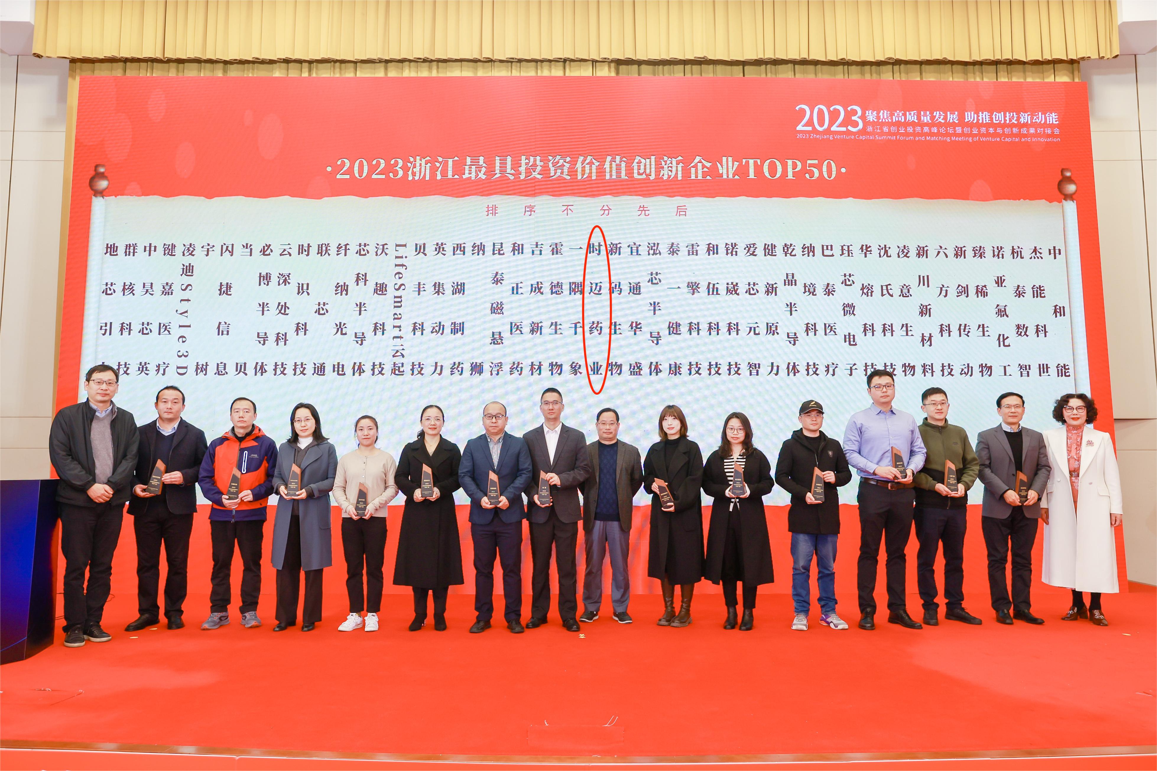 ? ? ? ?聚焦高質(zhì)量發(fā)展,助推創(chuàng)投新動(dòng)能。2023年11月5日,由浙江省科學(xué)技術(shù)廳主辦、浙江省創(chuàng)業(yè)投資協(xié)會(huì)承辦的“2023浙江省創(chuàng)業(yè)投資高峰論壇暨創(chuàng)業(yè)資本與創(chuàng)新成果對(duì)接會(huì)”成功舉辦,浙江時(shí)邁藥業(yè)有限公司憑借其源頭創(chuàng)新技術(shù)水平、產(chǎn)品硬實(shí)力、未來(lái)潛力等各方面的優(yōu)勢(shì),榮膺“2023浙江最具投資價(jià)值創(chuàng)新企業(yè)TOP50”。