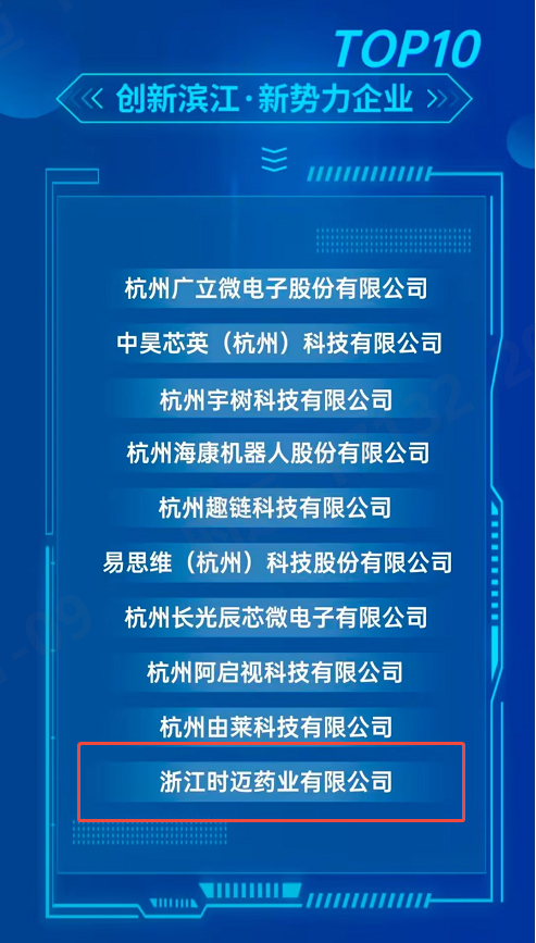 ? ? ? ?2025年1月9日,“建設(shè)創(chuàng)新濱江?加快形成新質(zhì)生產(chǎn)力——2024創(chuàng)新濱江閃耀時刻“揭曉,時邁藥業(yè)成功入選“創(chuàng)新濱江·新勢力企業(yè)TOP10”榜單,成為入榜的唯一一家生物醫(yī)藥企業(yè)。