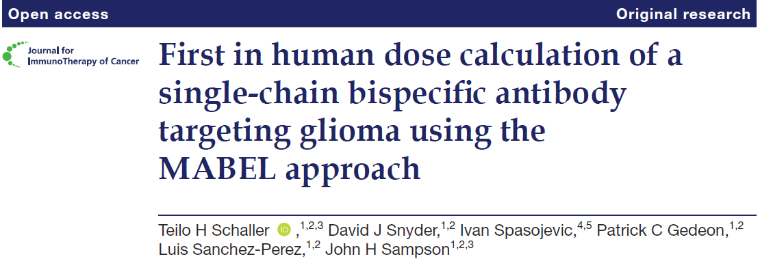 Schaller, Teilo H., et al. "First in human dose calculation of a single-chain bispecific antibody targeting glioma using the MABEL approach." Journal for Immunotherapy of Cancer 8.1 (2020).