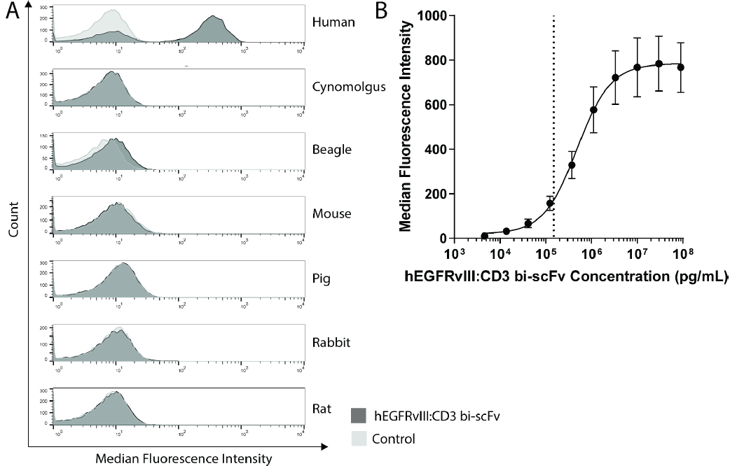 ? ? ? ?研究者使用了流式細(xì)胞法,分別檢測了EGFRvⅢ-CD3 bi-scFv雙特異性抗體與人、比格犬、CD-1小鼠、食蟹猴、Sprague Dawley大鼠、新西蘭白兔和豬的外周血單個核細(xì)胞(PBMC)的結(jié)合能力,來評估EGFRvⅢ-CD3 bi-scFv在細(xì)胞水平上與CD3ε的親和力。實驗結(jié)果顯示(圖1),EGFRvⅢ-CD3 bi-scFv只與人的PBMC結(jié)合,與其他種類動物的PBMC不結(jié)合。與人PBMC結(jié)合的EC20為150ng/mL。