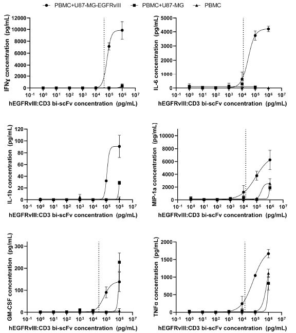 ? ? ? ?使用Luminex multiplex platform,分別在PBMC單獨存在、PBMC+ U87-MG-EGFRvⅢ細(xì)胞(EGFRvⅢ+)、PBMC+ U87-MG細(xì)胞(EGFRvⅢ-)條件下,對hEGFRvIII-CD3 bi-scFv介導(dǎo)的人PBMC細(xì)胞因子釋放進(jìn)行了檢測,使用PMA作為陽性對照。結(jié)果顯示(圖3),hEGFRvIII-CD3 bi-scFv介導(dǎo)人CD3+的細(xì)胞產(chǎn)生細(xì)胞因子的釋放量具有腫瘤抗原依賴性和劑量依賴性,在無EGFRvⅢ抗原存在的情況下,EGFRvIII-CD3 bi-scFv無法誘導(dǎo)細(xì)胞因子釋放;在有EGFRvⅢ存在的情況下,EGFRvIII-CD3 bi-scFv誘導(dǎo)人PBMC細(xì)胞因子IFN-?、IL-6、MIP-1α、GM-CSF和TNFα釋放的EC20分別為42.3、12.5、14.7、27.6和16.5 ng/mL。