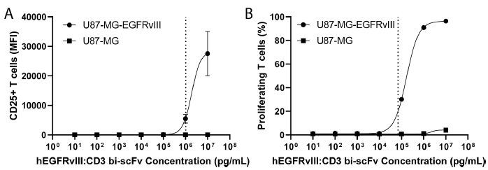 圖4 EGFRvIII-CD3 bi-scFv在EGFRvIII+體系中介導(dǎo)T細(xì)胞激活的EC20為1021ng/mL為,介導(dǎo)T細(xì)胞增殖的EC20為70.2 ng/mL