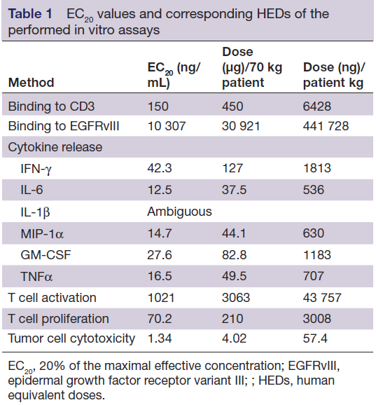 ? ? ? ?由公式2計算得出的MABEL劑量的理論受體占有率(引用與CD3ε結(jié)合的KD和細(xì)胞毒性實驗的EC20)為0.17%。對于激動劑而言,根據(jù)已知藥理學(xué)和臨床前實驗的經(jīng)驗,可接受的RO數(shù)據(jù)上限約為10%,本研究中基于MABEL劑量計算得出的RO的數(shù)據(jù)遠(yuǎn)低于這一限度。但研究人員也說明了這種方法的限制性,由于hEGFRvIII-CD3 bi-scFv為雙特異性抗體,該方法無法計算藥物同時與表達(dá)于不同細(xì)胞上的靶抗原(EGFRvIII于腫瘤細(xì)胞,CD3于T細(xì)胞)結(jié)合的理論受體占有率。
