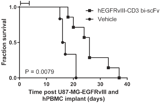 圖6 EGFRvIII-CD3 bi-scFv在U87-MG-EGFRvⅢ/PBMC-NSG鼠移植模型上可顯著提高小鼠生存率