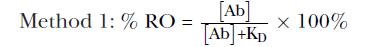 ? ? ? ?公式1基于米氏方程(Michaelis-Menten equilibrium),其中RO為受體占有率,Ab為抗體起始濃度(引用細(xì)胞毒性實驗EC20,1.34 ng/mL或26.3pM),KD為藥物對應(yīng)抗原的平衡解離常數(shù)。