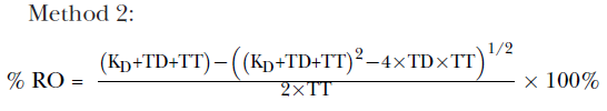 ? ? ? ?公式2為公式1的升級版,由于在已知體系中存在大量靶受體的情況下,由米氏方程計算出的RO可能不準(zhǔn)確,因此選用公式2進(jìn)行RO的計算。其中RO為受體占有率,KD為藥物對應(yīng)抗原的平衡解離常數(shù),TD為總藥物濃度(對應(yīng)細(xì)胞毒性實驗EC20,1.34 ng/mL或26.3pM),TT為總目標(biāo)濃度。