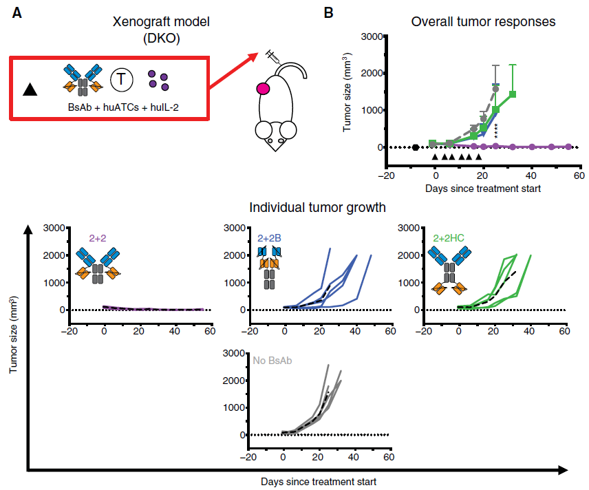 ? ? ? ?導(dǎo)語:近年來,雙特異性抗體(BsAb)的發(fā)展已成為治療凝血功能缺陷和癌癥的一種有前景的策略。T細胞雙特異性抗體(BsAbs)將細胞毒性T淋巴細胞與腫瘤細胞結(jié)合,誘導(dǎo)其破壞。盡管目前有60多種雙抗正在開發(fā)中,但諸如域間間距或空間構(gòu)型等參數(shù)的相對重要性在很大程度上是未知的。 ? ? ? ?本文中,Santich等剖析了一個對稱的二價雙抗(IgG-[L]-scFv:anti-CD3單鏈抗體與輕鏈融合的抗腫瘤IgG),以探討價態(tài)和空間構(gòu)型對BsAb誘導(dǎo)的T細胞毒性的重要性。他們的結(jié)果顯示,在體外和體內(nèi),將腫瘤和T細胞結(jié)合域放置在BsAb(順式構(gòu)型)的同一側(cè),與將它們定位在相反側(cè)(反式構(gòu)型)相比,在體外和體內(nèi)都能產(chǎn)生更強的抗腫瘤活性。此外,在同一個BsAb中使用兩個順式結(jié)構(gòu)進一步提高了細胞毒性(高達2000倍)。此外,與較小的(G4S1)或較大的(CH1-CH2-CH3)間隔相比,單個Ig結(jié)構(gòu)域(CL)分離抗原結(jié)合成分顯著增強細胞因子釋放和體內(nèi)腫瘤反應(yīng)。這些發(fā)現(xiàn)為改善BsAb的功能提供了指導(dǎo),并強調(diào)了空間構(gòu)型和雙二價作為開發(fā)參數(shù)的重要性。 ? ? ? ?Santich等以IgG-[L]-scFv架構(gòu)的BsAb為研究對象,其中之一就是單鏈可變片段(scFv)識別人CD3(huCD3ε)與每個IgG抗體輕鏈的C末端融合(圖1A)。盡管這種設(shè)計在體內(nèi)和體外對多種腫瘤抗原均具有極強的抗腫瘤活性[GD2(13)、CD33(10)、GPA33(11)和HER2(12)],其療效的基礎(chǔ)尚不清楚。通過研究,他們發(fā)現(xiàn):(1)雙抗價態(tài)對提高其體外細胞毒性具有重要意義;(2)使用單個Ig結(jié)構(gòu)域(CL)分離腫瘤和T細胞結(jié)合域可以顯著改善體外細胞因子分泌和體內(nèi)抗腫瘤反應(yīng);(3)將腫瘤和T細胞結(jié)合域放在BsAb(順式結(jié)構(gòu))的同一側(cè)可將細胞毒性作用提高50倍。 圖1. IgG-[L]- scFv與常見BsAb設(shè)計的體外比較。2+2為紫色,1+1B為藍色,1+1H為紅色。每條曲線代表一個BsAb,每個點代表一個濃度。 一、IgG-[L]-scFv格式比其他常見的BsAb設(shè)計更有效 ? ? ? ?Santich等通過將IgG-[L]-scFv結(jié)構(gòu)與廣泛用于T細胞重定向應(yīng)用的兩種BsAb結(jié)構(gòu)進行比較來進行研究:雙特異性T細胞銜接器(BiTE;與FDA批準的博納吐單抗(Blinatumomab)結(jié)構(gòu)相同)和IgG異二聚體(圖 1A)。使用人源化的3F8(hu3F8)和人源化的OKT3(huOKT3)的可變域序列,分別設(shè)計每個BsAb識別腫瘤細胞上的神經(jīng)節(jié)苷脂GD2(GD2)和T細胞上的huCD3ε。BiTE和IgG-[L]-scFv BsAb均使用標準的哺乳動物表達和親和純化方法生產(chǎn),而IgG異二聚體是通過兩種不同的IgG同二聚體(hu3F8 IgG和huOKT3 IgG)的受控Fab臂交換制得。對于這些親本IgG分子中的每一個,都引入了兩個Fc突變之一(帶有K409R的hu3F8或帶有F405L的huOKT3),以促進它們在還原條件下的單體化和優(yōu)先異二聚化(圖1B)。 ? ? ? ?通過流式細胞術(shù)評估與表達抗原的細胞的結(jié)合(圖1C),用識別了抗huCD3β(以測量GD2結(jié)合)或抗GD2的抗獨特型抗體檢測結(jié)合的BsAb(測量CD3結(jié)合)的每個BsAb。在此,就最大有效濃度和半最大有效濃度(EC50)而言,2+2結(jié)合的GD2+人類M14黑色素瘤細胞比1+1H或1+1B更有效,而所有三種形式均與激活的人類T細胞(huATC)類似地結(jié)合。 ? ? ? ?體外細胞毒性試驗(圖1D)顯示,2+2的效力是1+1H的500倍以上,效力是1+1B的20倍以上。這些結(jié)果表明2+2相對于1+1H的細胞毒性優(yōu)勢至少部分歸因于分子的形式。 ? ? ? ?接下來,他們研究了2+2在體外增強的效力是否會轉(zhuǎn)化為更強的體內(nèi)抗腫瘤活性(圖2)。首先,他們使用了免疫缺陷的異種移植小鼠模型IL-2rg?/?Rag2?/?BALB/c雙敲除(DKO)小鼠(圖2A)。DKO小鼠被皮下植入人類黑色素瘤(M14)、靜脈注射huATCs和BsAbs。2+2具有較強的抗腫瘤活性,可縮小大型腫瘤(高達1000mm3),而1+1H相對于對照組BsAbs (一種針對無關(guān)腫瘤抗原的IgG-[L]-scfv)沒有作用(圖2B)。 圖2. IgG- [L] -scFv與常見BsAb設(shè)計的體內(nèi)比較。2+2為紫色,1+1H為紅色,對照BsAb為灰色。 ? ? ? ?2+2和1+1B在體內(nèi)的藥代動力學(xué)特性差異很大,這使得兩者的比較變得復(fù)雜;1+1B的血清半衰期為15分鐘(18),而2+2的半衰期為3天。為了解決這個問題,他們使用了離體的“武裝”T細胞(EAT)異種移植模型,其中huATCs先與BsAbs結(jié)合,洗滌后再注射到成神經(jīng)細胞瘤患者衍生的異種移植(PDX)的DKO小鼠中。目的是創(chuàng)造嵌合抗原受體(CAR)樣T細胞,在過繼轉(zhuǎn)移前獲得其與腫瘤結(jié)合的潛能。它們隨后抗腫瘤功能上的任何差異都可能直接與用來“武裝”它們的BsAb的細胞毒性效力有關(guān)。在這些實驗中,對2+2、1+1B和1+1H預(yù)孵育方案進行了優(yōu)化,使所有EATs都含有相當(dāng)數(shù)量的抗GD2結(jié)合結(jié)構(gòu)域。3個BsAbs在37℃的體外條件下與huATCs穩(wěn)定結(jié)合達3天,表明EATs可以被當(dāng)作CAR樣T細胞處理。然而,在體內(nèi),2+2 EAT具有強大的抗腫瘤活性,而1+1H和1+1B EAT均未顯示任何益處。這些結(jié)果證實了2+2的增強功效,并證明其優(yōu)勢并不僅僅來自其藥代動力學(xué)。綜上,他們的體外數(shù)據(jù)和三種不同的動物模型的結(jié)果表明,IgG-[L]-scfv結(jié)構(gòu)比BiTE或IgG異源二聚體結(jié)構(gòu)具有更強的抗腫瘤反應(yīng)。 二、域間間隔對于IgG- [L] -scFv格式的抗腫瘤活性至關(g