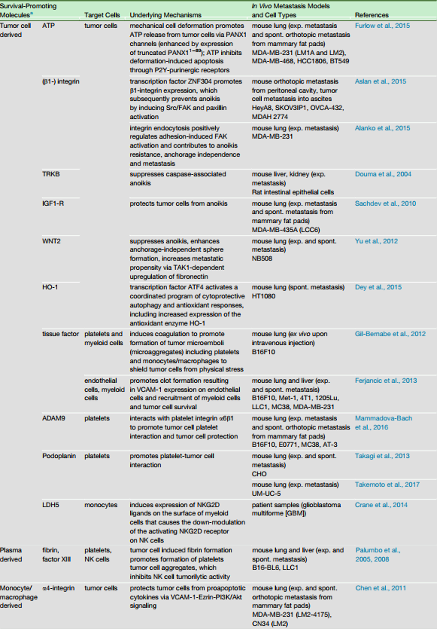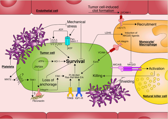 ? ? ? ?一、“抵御”免疫系統(tǒng)的攻擊 ? ? ? ?在實體瘤中,腫瘤細胞尚處在一個可抑制機體腫瘤免疫的免疫抑制微環(huán)境中。但當腫瘤細胞離開原發(fā)灶進入血管循環(huán),就會重新暴露于具有大量主動免疫監(jiān)視功能的免疫細胞環(huán)境中。自然殺傷細胞(NK細胞)作為先天免疫系統(tǒng)中的一部分,在腫瘤免疫監(jiān)測和抗腫瘤活性中起著核心作用。 ? ? ? ?在血管循環(huán)過程中腫瘤細胞采用多種方法抑制NK細胞的抗腫瘤活性(圖1和表1):部分腫瘤細胞通過金屬蛋白酶介導裂解脫落NKG2D的配體(MICA、MICB),使得腫瘤細胞表面與NK細胞結合的配體數(shù)減少;腫瘤細胞還可分泌TGFβ、前列腺素E2、腺苷等免疫調(diào)節(jié)因子來抑制NK細胞活性;此外腫瘤細胞還能通過包被活化的血小板來逃避NK細胞的捕獲,在這里,血小板不僅可以包裹腫瘤細胞從物理上屏蔽NK細胞,還能通過下調(diào)NK細胞上的NKG2D、釋放TGFβ、暴露NK細胞抑制性配體(如:糖皮質激素誘導的TNF相關配體)來抑制NK細胞活性。除此之外血小板還可將正常的MHCⅠ類分子轉移至腫瘤細胞表面,使腫瘤細胞得以逃避T細胞的捕獲。 圖1.血管內(nèi)腫瘤細胞的存活機制 表1.促進血管內(nèi)腫瘤細胞存活的分子機制