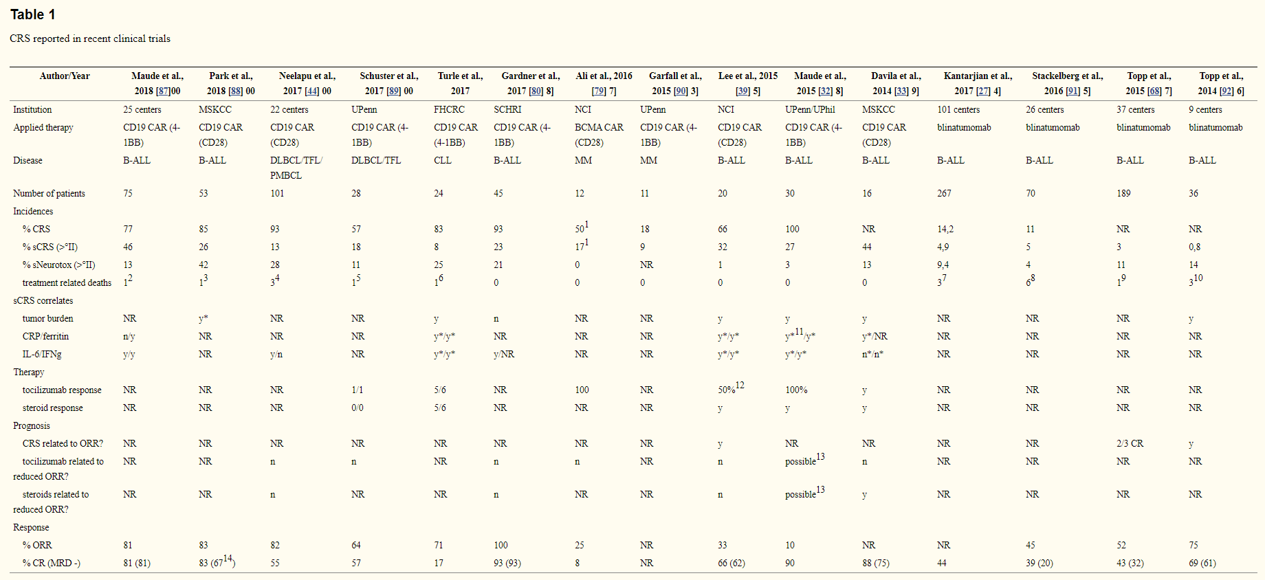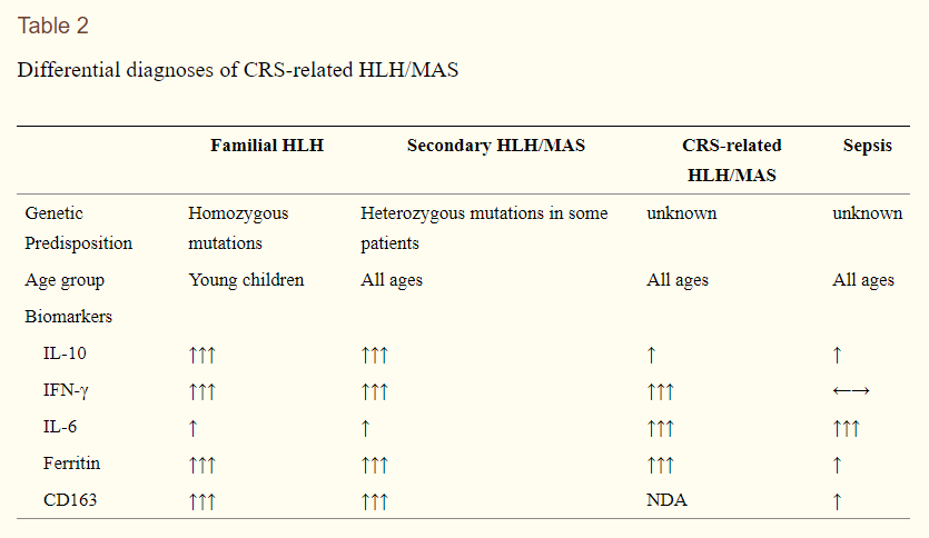 ? ? ? ?過去的10年里,癌癥免疫進(jìn)展突飛猛進(jìn),諸如免疫檢查點、T細(xì)胞接合療法(BiTE雙抗、CAR-T)等高效的免疫療法在臨床試驗中已顯示出療效,其中一些藥物已經(jīng)獲得了監(jiān)管部門的批準(zhǔn)。但是,隨著臨床經(jīng)驗的增多,人們對這些藥物潛在的副作用,尤其是細(xì)胞因子釋放綜合征(CRS)的認(rèn)識也日益提高。本文主要綜述了CRS的臨床表現(xiàn)、發(fā)生率、鑒別診斷、發(fā)生機制等。 ? ? ? ?細(xì)胞因子釋放綜合征(CRS)是一種全身性炎癥反應(yīng),可由多種因素觸發(fā),如感染和藥物?!凹?xì)胞因子釋放綜合征”一詞最早在上世紀(jì)90年代早期提出,在CD3抗體(OKT3)莫羅單抗用于治療體器官移植中提出。隨后,在其他抗體輸液中也發(fā)現(xiàn)CRS,如抗胸腺細(xì)胞球蛋白(ATG)、CD28超激動劑TGN1412、利妥昔單抗、奧比努妥單抗、阿侖單抗、 brentuximab、dacetuzumab和納武利尤單抗。在服用非蛋白類抗癌藥物如奧沙利鉑和來那度胺中也觀察到CRS。此外,在半相合供體干細(xì)胞移植和移植物抗宿主病中也有報道。由大量T細(xì)胞激活造成的細(xì)胞因子風(fēng)暴是在嚴(yán)重病毒感染如流感中提出的病理機制。? ? ? ? ?近來,隨著新型與T細(xì)胞結(jié)合的免疫治療制劑的成功,CRS的受關(guān)注度日益增長,且代表了這類療法中最常見的嚴(yán)重不良反應(yīng)之一。T細(xì)胞接合免疫療法包括BiTE和CAR-T,這兩種免疫治療策略近年來已推廣到臨床應(yīng)用,并且在幾種血液系統(tǒng)惡性腫瘤中表現(xiàn)出顯著療效,如急性淋巴細(xì)胞性B細(xì)胞白血?。˙-ALL)、慢性淋巴細(xì)胞性白血病(CLL)和彌漫性大B細(xì)胞淋巴瘤(DLBCL)。 ? ? ? ?2014年,經(jīng)過FDA的加速審批,八項CD19的CD3 BiTE博納吐單抗(blinatumomab)被批準(zhǔn)用于費城染色體陰性的復(fù)發(fā)性或難治性B細(xì)胞前體ALL。最近,兩種CAR-T細(xì)胞療法tisagenlecleucel和axicabtagene ciloleucel已獲得FDA批準(zhǔn)用于難治性CD19陽性B-ALL和復(fù)發(fā)或難治性大B細(xì)胞淋巴瘤。目前已有許多在臨床中開發(fā)階段的雙抗、多抗和CAR-T。此外,處于早期臨床開發(fā)T細(xì)胞接合免疫療法包括:雙親和性再靶向抗體(DART)、對抗癌癥的免疫動員單克隆抗體TCRs(ImmTAC)和其他基于TCR的抗體。? ? ? ? ?第一個T細(xì)胞接合療法blinatumomab]和靶向CD19的CAR-T的研究表明,CRS是這些療法的最重要的不良事件。因此,當(dāng)前大多數(shù)CRS數(shù)據(jù)均來自血液惡性腫瘤的CAR-T和blinatumomab研究。在CD19靶點的CAR-T臨床試驗中,CRS的報道頻率高達(dá)100%,嚴(yán)重以致危及生命。將來,T細(xì)胞接合療法藥物將越來越多地在臨床研究和學(xué)術(shù)癌癥中心之外使用,對于腫瘤學(xué)家和重癥監(jiān)護(hù)專家來說,熟悉這種并發(fā)癥及其臨床管理就變得至關(guān)重要。? 表1:近期臨床試驗中報道的CRS 一、CRS的臨床表現(xiàn) ? ? ? ?CRS可能出現(xiàn)多種癥狀,從流感樣輕度癥狀到嚴(yán)重的威脅生命的過度炎癥反應(yīng)(圖1)。CRS輕度癥狀包括發(fā)燒、疲勞、頭痛、皮疹、關(guān)節(jié)痛和肌痛。較嚴(yán)重的患者以低血壓和高燒為特征,可發(fā)展為不受控制的全身性炎癥反應(yīng),出現(xiàn)需要升壓藥循環(huán)的休克、血管滲漏、彌散性血管內(nèi)凝血和多器官系統(tǒng)衰竭。CRS患者常見的實驗室異常包括血細(xì)胞減少、肌酐和肝酶升高、凝血參數(shù)紊亂以及高CRP(C型反應(yīng)蛋白)。 圖1:CRS的臨床表現(xiàn) ? ? ? ?呼吸道癥狀在CRS患者中很常見。輕度患者可能會出現(xiàn)咳嗽和呼吸急促,但可能會發(fā)展至急性呼吸窘迫綜合征(ARDS),并伴有呼吸困難、低氧血癥,胸部X光檢查出現(xiàn)雙側(cè)渾濁。ARDS有時可能需要呼吸機輔助。值得注意的是,在患有CRS的患者中,需要呼吸機輔助的情況通常不是由于呼吸窘迫導(dǎo)致的,而是由于神經(jīng)毒性繼發(fā)的氣道不受保護(hù)而引起的。嚴(yán)重CRS的患者還會出現(xiàn)腎臟衰竭或心臟功能不全、超聲射血分?jǐn)?shù)降低的癥狀。此外,嚴(yán)重CRS的患者經(jīng)常出現(xiàn)血管滲漏,并伴有周圍和肺水腫。? ? ? ? ?嚴(yán)重的情況下,CRS可能伴有臨床癥狀和實驗室指標(biāo)異常,類似于噬血細(xì)胞淋巴組織細(xì)胞增多癥(HLH)或巨噬細(xì)胞活化綜合征(MAS)。CRS相關(guān)HLH患者表現(xiàn)出HLH/MAS的典型臨床和實驗室檢查結(jié)果,例如高燒、高鐵蛋白水平和高甘油三酯血癥。在B-ALL的blinatumomab的III期研究中,13名CRS患者中有4名出現(xiàn)HLH。? ? ? ? ?一些患者在接受T細(xì)胞接合療法后出現(xiàn)神經(jīng)毒性。神經(jīng)系統(tǒng)癥狀包括輕度混亂、發(fā)詞困難、頭痛、幻覺、失語癥、偏癱、顱神經(jīng)麻痹、癲癇和嗜睡。在CAR-T細(xì)胞療法中,神經(jīng)毒性是第二個最常見的嚴(yán)重不良事件,因此引入了專有術(shù)語“ CAR-T相關(guān)性腦病綜合征”(CRES)。但CAR-T的神經(jīng)毒性似乎與CRS并不直接相關(guān),因為神經(jīng)系統(tǒng)癥狀并不總是與CRS發(fā)作同時發(fā)生,神經(jīng)毒性可以在CRS之前或CRS消退后發(fā)生。由于神經(jīng)毒性與CRS缺乏嚴(yán)格時間關(guān)聯(lián)性,導(dǎo)致對神經(jīng)系統(tǒng)癥狀的病理生理學(xué)了解較少,但至少神經(jīng)毒性可能至少有部分是獨立于CRS的。此外,臨床試驗的經(jīng)驗表明,神經(jīng)系