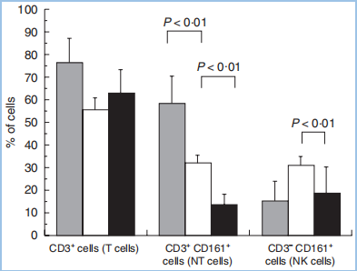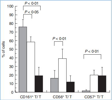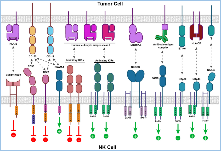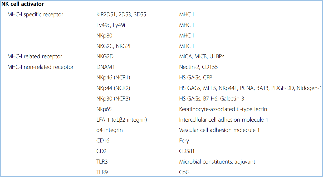 二、迷失自我的狂歡 ? ? ? ?從CD161在NK細(xì)胞上的調(diào)控模式看,存在順式作用(NK細(xì)胞能在某種刺激條件下,同時表達CD161和LLT1,抑制自身活性)、反式作用(B細(xì)胞、T細(xì)胞、樹突狀細(xì)胞表達LLT1,從而抑制NK細(xì)胞)。阻斷CD161-LLT1的結(jié)合,可以增強NK細(xì)胞的細(xì)胞毒性,釋放IFN-γ。 ? ? ? ?另一方面,CD161+CD8+的T細(xì)胞,被分類為組織追蹤MAIT(粘膜相關(guān)不變T細(xì)胞),細(xì)胞毒性Tc17細(xì)胞,或者記憶T細(xì)胞,具有組織追蹤和增強的細(xì)胞毒性。記憶細(xì)胞可以對病毒感染、細(xì)菌感染、抗原呈遞細(xì)胞的刺激做出響應(yīng),進而上調(diào)細(xì)胞因子,比如INF-γ、IL-17,釋放顆粒酶。 ? ? ? ?利用NK細(xì)胞的免疫檢查點機制,對NK細(xì)胞的抑制解除,以及激活,是一種新的免疫治療的前沿。我在之前的文章(https://mp.weixin.qq.com/s/5bWB41CAyKXi0348XTtIHw),總結(jié)了NK細(xì)胞作為免疫治療的新方向,列舉了一些NK細(xì)胞的激活或抑制型受體。比如激活型的KIR2DS、NKp80、NKp46/44/30、NKG2C/D/E、DNAM-1、CD16a,抑制型的KIR3DL、NKG2A/CD94、CD161/LLT1、PD-1、TIGIT、CD96、LAG3等(圖7、8)。 圖7 NK細(xì)胞表面的抑制型受體(紅)和激活型受體(綠)。ITIM,immuno-receptor tyrosine-based inhibitory motifs,免疫受體中基于酪氨酸的抑制型模體;ITAM,immuno-receptor tyrosine-based activation motifs,免疫受體中基于酪氨酸的激活型模體。KIR,killer Ig-like receptor,殺手細(xì)胞類免疫球蛋白受體。 圖8 NK細(xì)胞受體的分類。在NK細(xì)胞上,順式結(jié)合的CD161和LLT1,與MHC-I結(jié)合,抑制其活性。 ? ? ? ?NK細(xì)胞,占PBMC的5~10%,與CD8+ T細(xì)胞,有類似的殺傷活性(cytotoxicity),但是細(xì)胞的標(biāo)記物與CD8+ T細(xì)胞有顯著差異,不表達CD3和TCR。NK細(xì)胞的抗原特征為CD56+CD3-,其中85%~95%的NK細(xì)胞為CD56dim(暗)CD16ahigh,主要是成熟的殺傷細(xì)胞,高表達KIR,可分泌穿孔素和顆粒酶,剩余的為CD56bright(亮)CD16alow,有未成熟的NK細(xì)胞,低表達KIR和NKG2A/CD94。NK細(xì)胞的分類中,還包括抗原呈遞NK(APNK)、輔助NK(NKh)、調(diào)節(jié)NK(NKreg)。 ? ? ? ?與T細(xì)胞需要抗原呈遞的過程不同,細(xì)胞毒性NK細(xì)胞是天然免疫系統(tǒng)的一部分,不需要抗原呈遞,組織相容性復(fù)合體(MHC)I類復(fù)合體與NK細(xì)胞結(jié)合,通常激活抑制型的受體(含ITIM,圖7),抑制了NK細(xì)胞的活性,這也是組織細(xì)胞避免被NK細(xì)胞殺傷的機制。在一部分腫瘤組織中,腫瘤細(xì)胞雖然下調(diào)了MHC-I的表達,規(guī)避了T細(xì)胞的識別,但因為MHC下調(diào)激活了NK細(xì)胞的活性,補充了T細(xì)胞的不足。 ? ? ? ?NK細(xì)胞的殺傷機制,稱為“missing self”,即“迷失自我”。也有研究表明,MHC-I可激活NK細(xì)胞(圖8)。因此,NK細(xì)胞的殺傷活性,基于抑制和激活信號的平衡。 ? ? ? ?因此,如果不考慮腫瘤內(nèi)環(huán)境的惡劣、腫瘤細(xì)胞對NK細(xì)胞的塑造、調(diào)節(jié)型細(xì)胞的抑制的話,類比NKG2A/CD94,我們也可以將CD161/LLT1加入到這一場NK細(xì)胞“迷失自我的狂歡”中。目前,關(guān)于NK細(xì)胞的抗體(BiKE、TriKE),或者CAR-NK的臨床實驗,也在如火如荼進行中,也可以給我們一些借鑒。 ? ? ? ?然而,我們不能過于樂觀地估計NK細(xì)胞的殺傷,除了血液淋巴瘤,還有腫瘤微環(huán)境的巨大挑戰(zhàn): ? ? ? ?1. 抑制信號,包括抑制型受體介導(dǎo)的(圖7、8),以及抑制型細(xì)胞因子,比如TGFβ、IL-10; ? ? ? ?2. 抑制細(xì)胞,Treg、NKreg、骨髓瘤衍生抑制型細(xì)胞(MDSC)、基質(zhì)細(xì)胞、成纖維細(xì)胞、腫瘤細(xì)胞;比如,Treg細(xì)胞、MDSC細(xì)胞表達TGFβ,結(jié)合NK細(xì)胞的TGFR2,從而下調(diào)其表面的NKG2D、NKp30這些激活型受體,使其被激活的能力降低; ? ? ? ?3. 浸潤能力,在非小細(xì)胞肺癌(NSCLC)中,未檢測到NK細(xì)胞亞群,但是存在CD161+CD4+、CD161+CD8+的T細(xì)胞。在結(jié)直腸癌中,幾乎完全排除NK細(xì)胞的浸潤; ? ? ? ?4. 腫瘤微環(huán)境中,缺氧、低糖,顆粒酶B的半衰期顯著降低。 ? ? ? ?我們可以通過IL-12、IL-15、IL-18,是NK細(xì)胞聚集在腫瘤組織并維持活性。然而,IL-12促進CD161的表達,進而抑制NK細(xì)胞的活性。IL-15具有促進NK細(xì)胞增殖和殺傷活性的能力,但是單獨使用,并不能維持NK細(xì)胞的滲透能力。