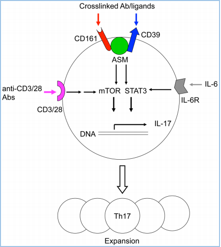 一、給你一張過去的CD ? ? ? ?CD161,別名NKRP1A(NK受體P1A)、KLRB1、CLEC5D,以下均稱為CD161。其中,KLRB1(killer cell lectin-like receptor subfamily B1)是推薦的名稱,中文翻譯為“殺傷細(xì)胞的類凝集素受體亞家族B成員1號”。CD161目前只發(fā)現(xiàn)一種序列,沒有其他變體。 ? ? ? ?LLT1,別名CLEC2D(前言的Cell所稱),以下均稱為LLT1,作為CD161的配體。LLT1(lectin-like transcript 1)為CLEC2D的1號變體,中文翻譯“類凝集素轉(zhuǎn)錄體1”。這意味著CLEC2D存在多個變體,其中只有變體1,即LLT1,具有結(jié)合CD161的能力,且能夠激活下游信號。其他變體,比如變體2、4,不結(jié)合CD161。 ? ? ? ?CLEC,C-type lectin domain family,可見CD161和LLT1同屬于這個大家族,分屬不同的亞家族。 ? ? ? ?CD161和LLT1的表達 ? ? ? ?CD161主要表達于粒細(xì)胞,以及單個核細(xì)胞的表面(圖3A),表達特異性較好。單個核細(xì)胞,包括NK細(xì)胞和T細(xì)胞,其中T細(xì)胞包括Th17、NK T、記憶T細(xì)胞,但不包括原始T細(xì)胞(圖3B)。另外,IL-17的表達與CD161的表達有極大的相關(guān)性,比如CD4+ TCRαβ+、CD8+ TCRαβ+、CD4-CD8- TCRαβ+、CD4-CD8-TCRγδ+等產(chǎn)生IL-17的細(xì)胞,它們存在CD161表達。另外,CD161+的細(xì)胞,IL-23R和RORC的表達量顯著高于CD161-的細(xì)胞。 ? ? ? ?LLT1主要表達在小腸的派爾淋巴結(jié),以及粒細(xì)胞、淋巴細(xì)胞(包括B細(xì)胞、T細(xì)胞、NK細(xì)胞)、扁桃體、肺、腎上腺、腎等部位(圖3C)。外周循環(huán)的B細(xì)胞、T細(xì)胞、NK細(xì)胞、單核細(xì)胞、樹突狀細(xì)胞,在靜息狀態(tài)下,不表達LLT1,但是激活后,比如TLR(toll-like receptor)激活的類漿細(xì)胞、單核細(xì)胞衍生的樹突狀細(xì)胞、激活的B細(xì)胞,都一定程度地表達LLT1,對NK細(xì)胞有抑制作用,但對T細(xì)胞具有激活作用。 圖3A,CD161在粒細(xì)胞和單個核細(xì)胞中高表達,主要在淋巴組織表達,摘自bgee.org。 圖3B,CD161的表達情況,分別在患者的上皮組織內(nèi)淋巴細(xì)胞(灰)、肝淋巴細(xì)胞(白)、外周血淋巴細(xì)胞,分別是大約75%、60%、20%。其中,上皮組織內(nèi)的CD3+CD161+陽性的天然T細(xì)胞,顯著高于CD3-CD161+的NK細(xì)胞。 圖3B,LLT1在小腸的派爾淋巴結(jié)高表達,主要在淋巴節(jié)和粒細(xì)胞表達,摘自bgee.org。 ? ? ? ?CD161和LLT1的信號通路 ? ? ? ?CD161在NK細(xì)胞上,作為抑制型受體,通過與其配體LLT1(CLEC2D)的結(jié)合,抑制NK細(xì)胞的細(xì)胞毒性,抑制IFN-γ的釋放(圖4A)。也有研究表明,在T細(xì)胞上,尤其是Th17上,CD161可作為其細(xì)胞亞群標(biāo)記,為激活型受體,激活Th17表達和分泌IL-17(圖4B)。也可以通過TCR信號通路激活T細(xì)胞,促進IFN-γ的釋放。 圖4A,NK細(xì)胞機制。LLT1表達在特殊的腫瘤組織中,比如三陰性乳腺癌(TNBC)、前列腺癌、B細(xì)胞非霍奇金淋巴瘤細(xì)胞。表達于腫瘤細(xì)胞表面的LLT1,與NK細(xì)胞表達的CD161結(jié)合,給出抑制信號,降低其細(xì)胞毒性。LLT1在部分腫瘤組織中高表達,以抑制NK細(xì)胞的殺傷。 圖4B,T細(xì)胞機制。神經(jīng)磷脂酶(ASM),調(diào)節(jié)CD39和CD161的細(xì)胞內(nèi)信號,并促使Th17的增殖。在Th17分化條件下,CD4+ T細(xì)胞內(nèi),MHC/CD3/CD28,以及IL-6的刺激信號,激活mTOR和STAT3信號。同時,CD39和CD161的刺激信號進一步增強了上述信號,最終導(dǎo)致Th17增殖,以及分泌IL-17。 ? ? ? ?CD161的胞內(nèi)區(qū)并沒有NK細(xì)胞受體常見結(jié)構(gòu)域的ITIM,即“免疫受體中基于酪氨酸的抑制型模體”,或ITAM,激活性模體。因此,CD161激活后的下游信號,不同于常見的NK細(xì)胞受體激活模式,并且在NK、T細(xì)胞中可能產(chǎn)生了不同的結(jié)果:一方面,胞內(nèi)域通過與CD39的結(jié)合,激活神經(jīng)磷脂酶(ASM、SMPD1),通過STAT3、mTOR等通路,上調(diào)細(xì)胞內(nèi)神經(jīng)酰胺的表達;另一方面,激活A(yù)KT1/PKB和RPS6KA1/RSK1激酶和下游信號,這與通過CD3激活T細(xì)胞的通路一致。 ? ? ? ?研究表明,CD161的表達,受IL-12調(diào)控,依賴于IL-12作用時間和劑量。IL-12可提高NK細(xì)胞表面的CD161,進而抑制NK細(xì)胞活性,這是一個負(fù)反饋的過程。另一方面,IFN-β可導(dǎo)致CD161表達降低。? ? ? ? ?CD161和LLT1的結(jié)構(gòu)和修飾 ? ? ? ?CD161是一種二型的穿膜糖蛋白,存在3對鏈內(nèi)二硫鍵,以及1個N糖基化位點(圖5)。 ? ? ? ?LLT1也是一種二型的穿膜糖蛋白,存在2對鏈內(nèi)二硫鍵,以及2個N糖基化位點(圖5)。 ? ? ? ?二型的穿膜蛋白,即N端為胞內(nèi)域,C端為胞外域。