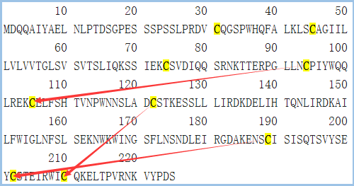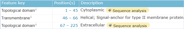 圖5 CD161的結(jié)構(gòu)信息,摘自Uniprot.org。CD161全長為225個氨基酸,保外域為67~225,其中含有3對鏈內(nèi)二硫鍵,并存在1個N糖基化位點。